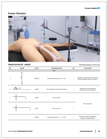 The Femur Elevator Retractor Set uses a sterile set-up to securely attach to the OR bedrail, providing stable elevation of the femur and eliminating the need for extra staff. The Femur Hook and Micro-Adjustable Handle allow for consistent and precise positioning.